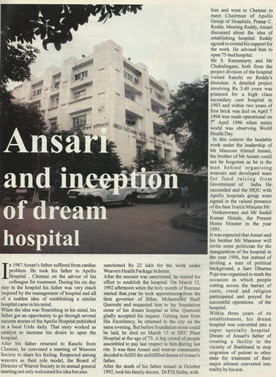 • In the year 1996 A Super speciality hospital in the name and style of “Abdur Razzaque Ansari Memorial weavers’ Hospital” was established where Mr. Ansari was fully devoted his time from its concept to its commissioning of the hospital and run the same successfully as a Director Projects for two decades now Medanta Hospital, is running this hospital and he being a Senior Advisor of the hospital still contributing a lot for the hospital.