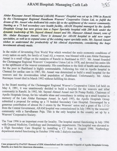 Indian Institute of Management Ahmedabad is a world class acclaimed business school located in Ahmedabad, Gujarat, India, They offer various courses in Management and produces world class business professional including healthcare professionals.They have executive Healthcare Management programs for the working professionals. In their course material they have incorporated the case study of Abdur Razzaque Ansari Weavers’ Hospital Irba Ranchi in the name of “ANSARI and Inception of Dream Hospital”.